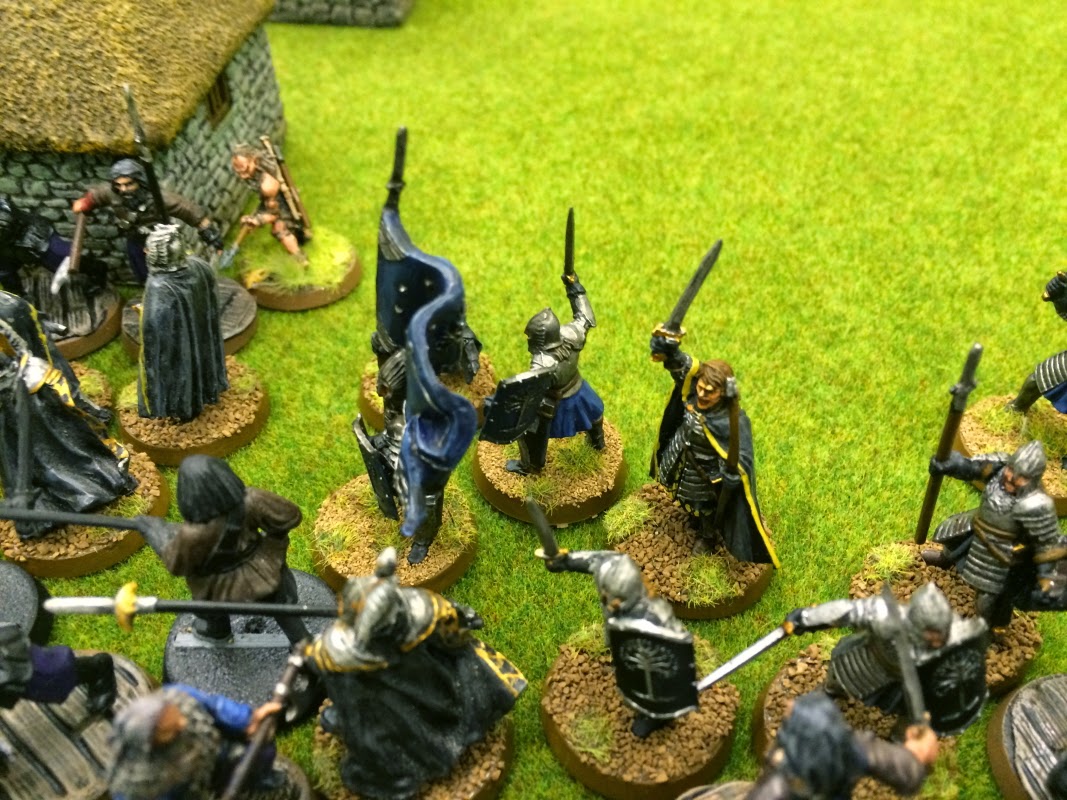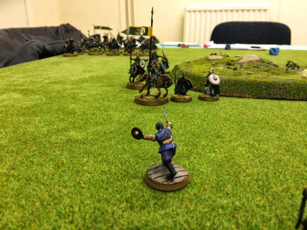 Rick and Laurence played good - Rick had 500 points of Gondor led by Isildur (as an independent hero) with Beregond taking fountain court and Citadel Guard and Ghan buru Ghab taking Woses as allies, whilst Laurence had 500 points of mounted Rohan, Eomer and Erkenbrand leading red shields, Royal Guard and Sons of Eorl. I was concerned by the cavalry, it's tough hitting and fast moving, lethal against against my low defense.